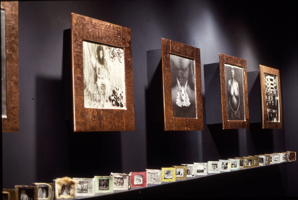 Materials: Apples & Oranges, coconut shells treated to becomes vessels that contain rum.Photographs with copper mats, Embellished wood chairs, embellished shirt & vest, Cowry Shells,